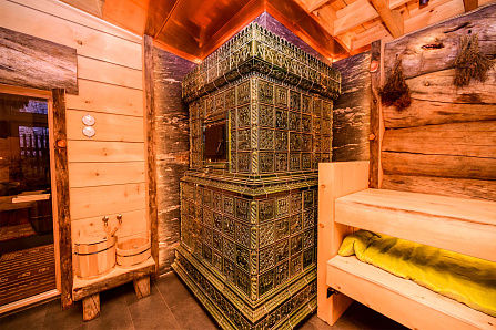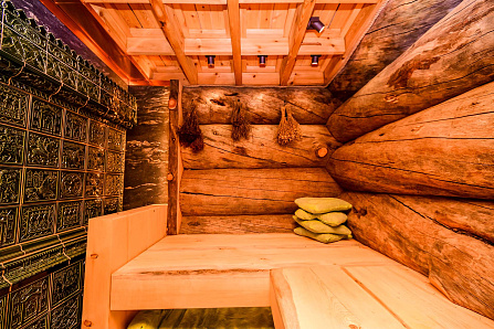 ⠀ Ну и, конечно же, сердце бани - простая и лаконичная парная с печкой, которая работает на газу и на дровах.