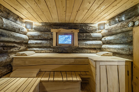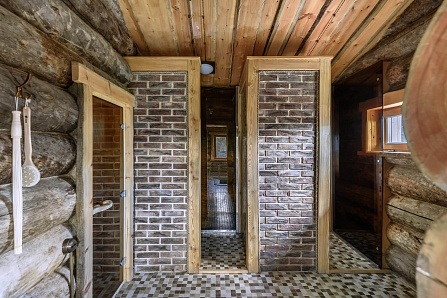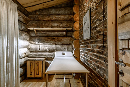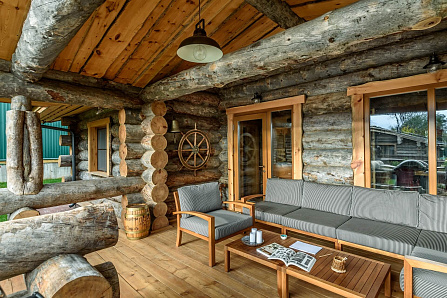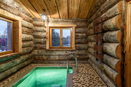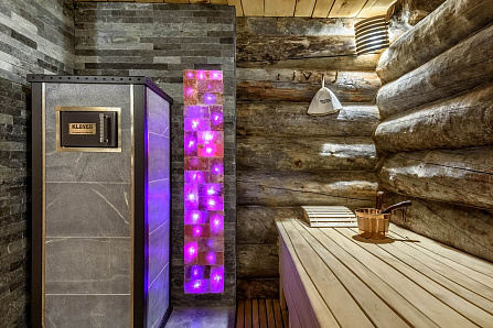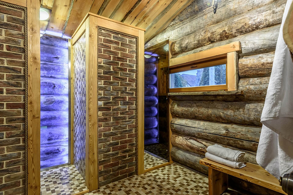 При своём компактном размере, в этой бане есть все, что нужно, а именно: большая терраса с мягкой группой и грилем, очень комфортная и уютная гостиная с небольшой кухней, где можно приготовить закуску после бани, небольшая массажная, парная с отделкой из дубовых досочек, купель с ледяной водой.