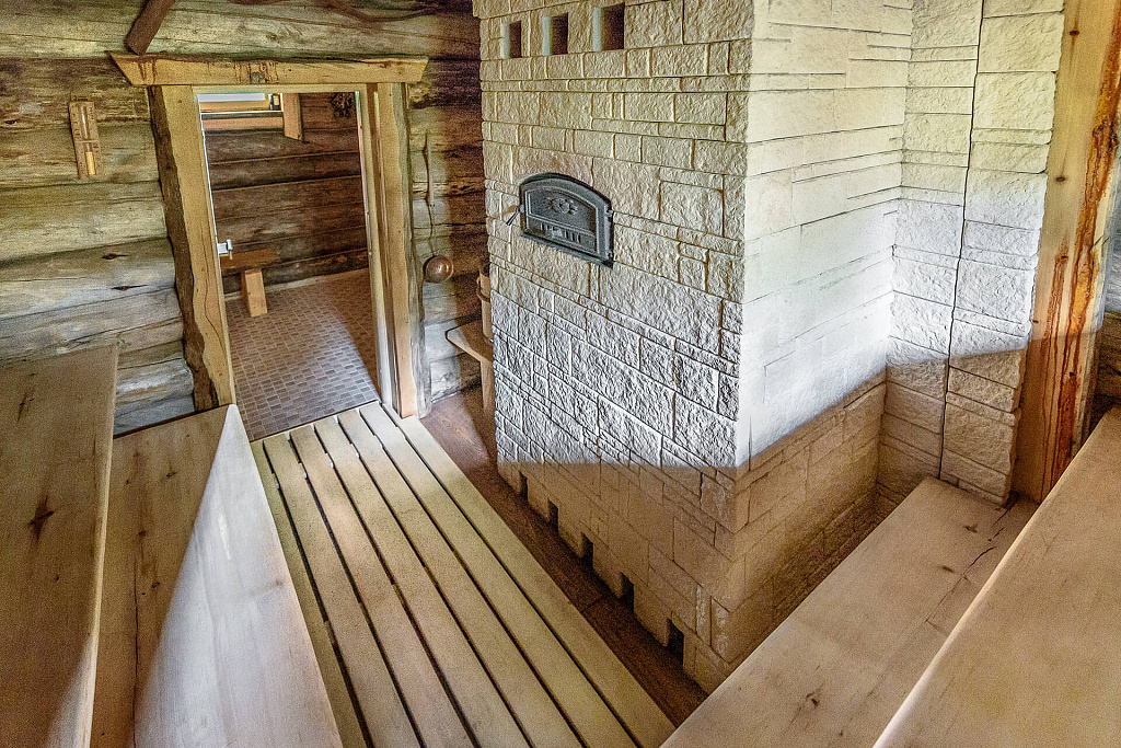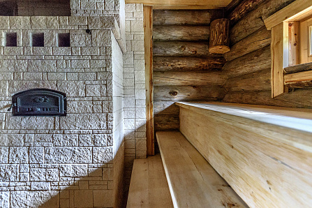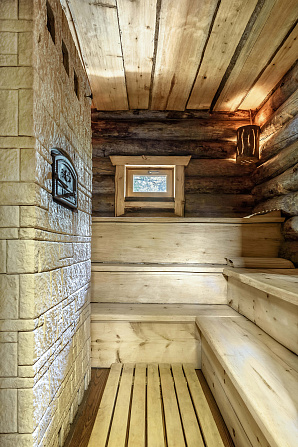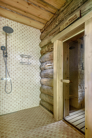 Небольшая баня, состоящая из комнаты отдыха, парной и помывочной.Также есть небольшой бассейн. Пример того, что можно сделать на стандартном фундаменте. Мы лишь добавили террасу с одной и небольшой дровник с другой стороны.