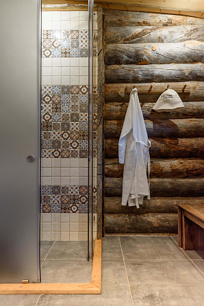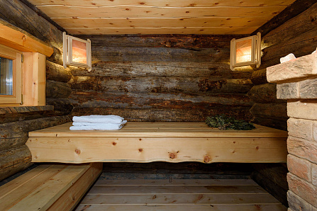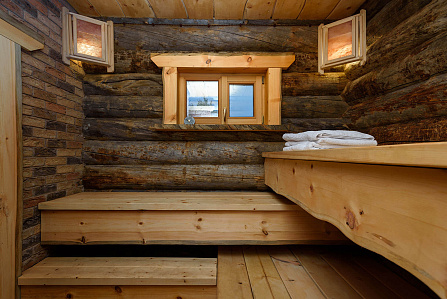 Сочетание современной архитектуры с природным материалом - изюминка бани. Элементы наружной отделки - каменный пояс, палубы из лиственницы, односкатная крыша.
