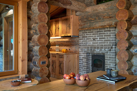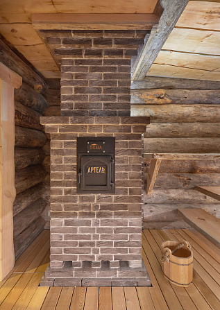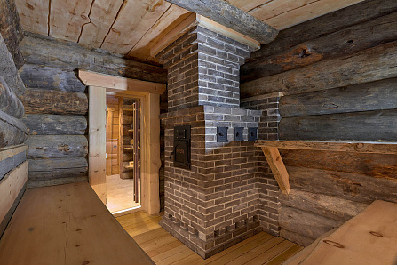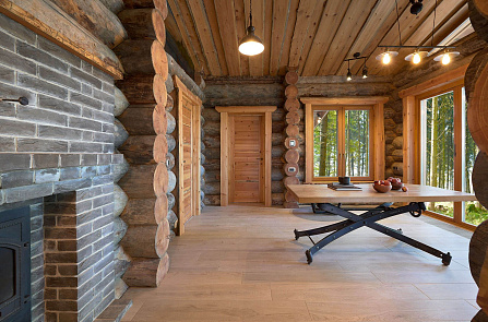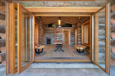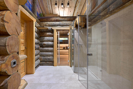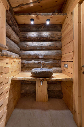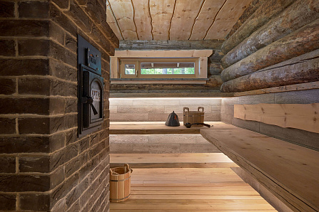 По сути, баня построена в стиле hi-tech, но она сочетается с нашими традиционными приемами: открытая стропильная система, сухостойная доска Кело, сдвижная дверь-гармошка. Цокольная часть бани отделана натуральным камнем.